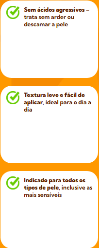 Ideal para todos os tipos de pele, inclusive as mais sensíveis. Chega de esconder a pele por vergonha das manchas! Recupere sua autoestima com um cuidado diário que trata e realça sua beleza natural.